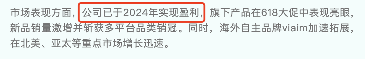 市场表现方面,公司已于2024年实现盈利。同时,海外自主品牌viaim加速拓展,在北美、亚太等重点市场增长迅速。