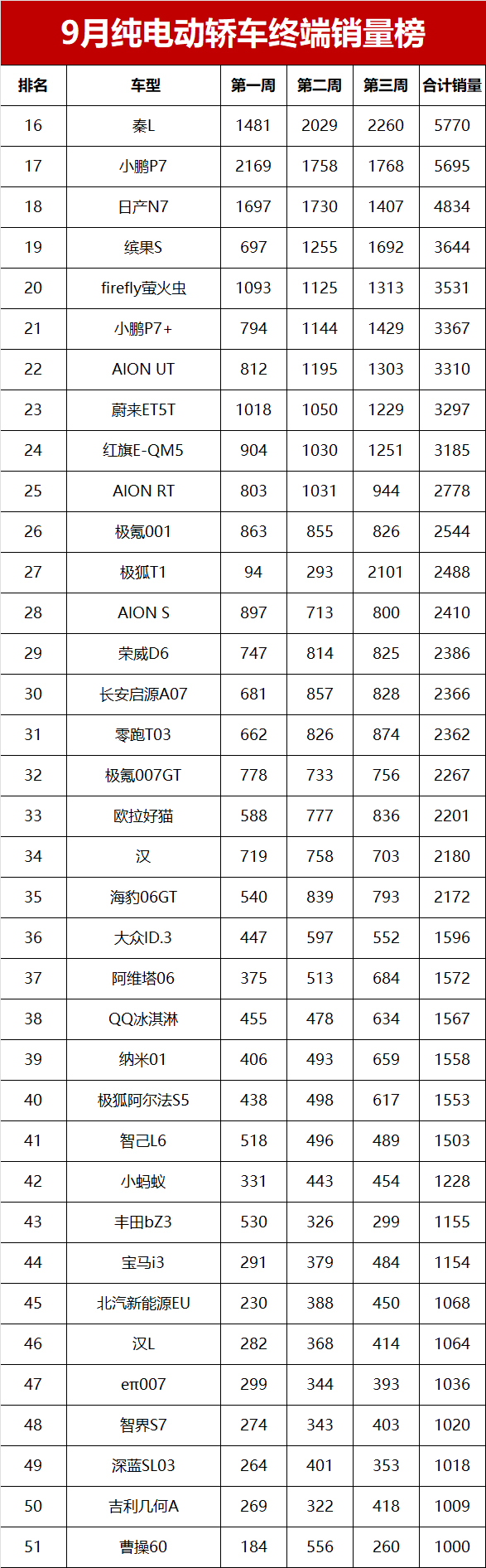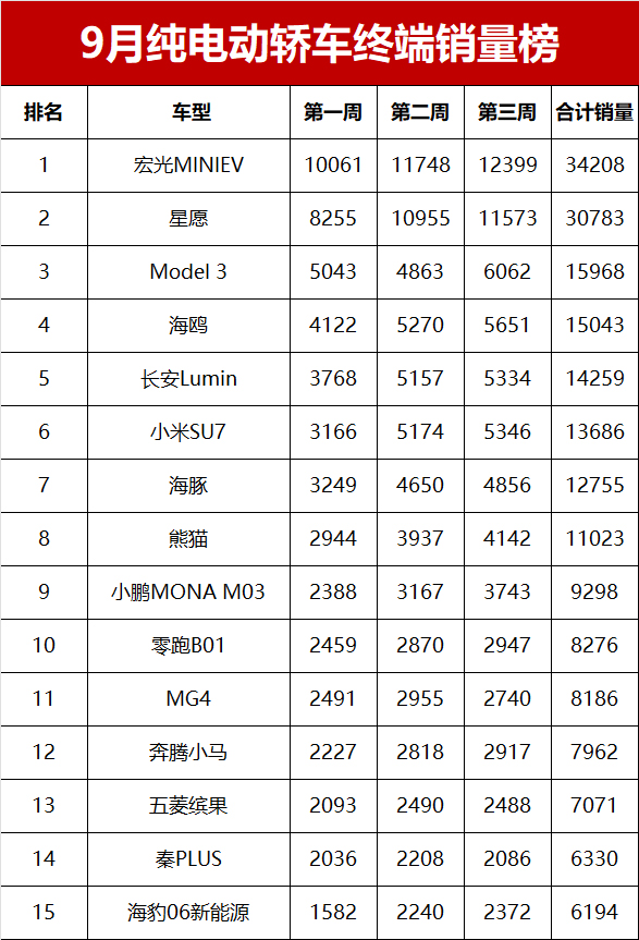 小米SU7成为榜单中的黑马选手,以13686辆排名第六位,这一成绩与小米汽车9月交付量突破4万辆的整体表现相呼应,其第三周销量环比提升3.3%,产能释放后市场接受度持续走高。熊猫以11023辆排名第八位,同样实现连续三周销量增长,成为10万级以下市场的重要玩家。