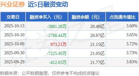 兴业证券:10月13日融券卖出4.48万股,融资融券余额20.5亿元
