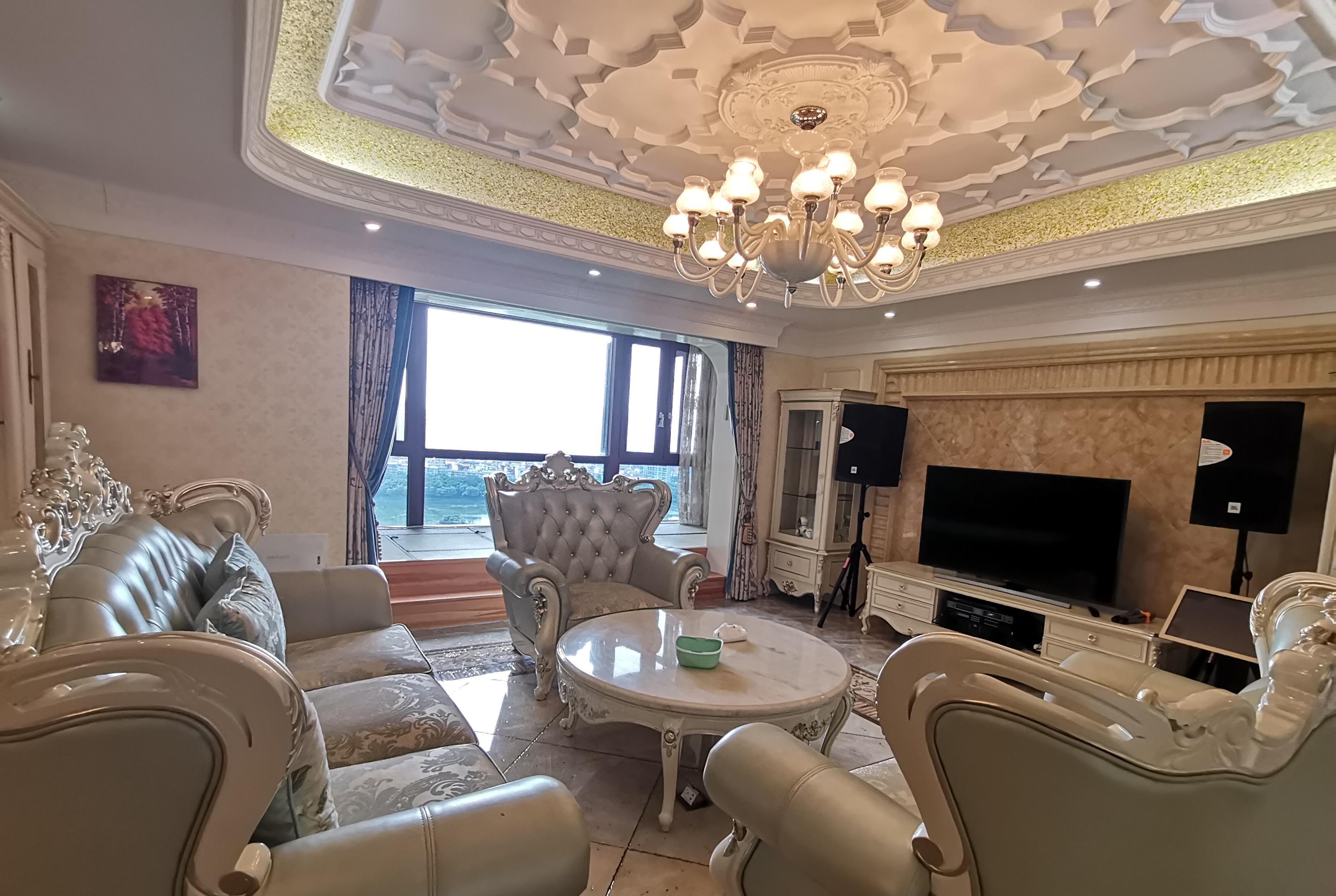 举个例子,以上这套房在装修的时候追求的是欧式风格,看上去奢华是奢华,却犯下了“五不该”: