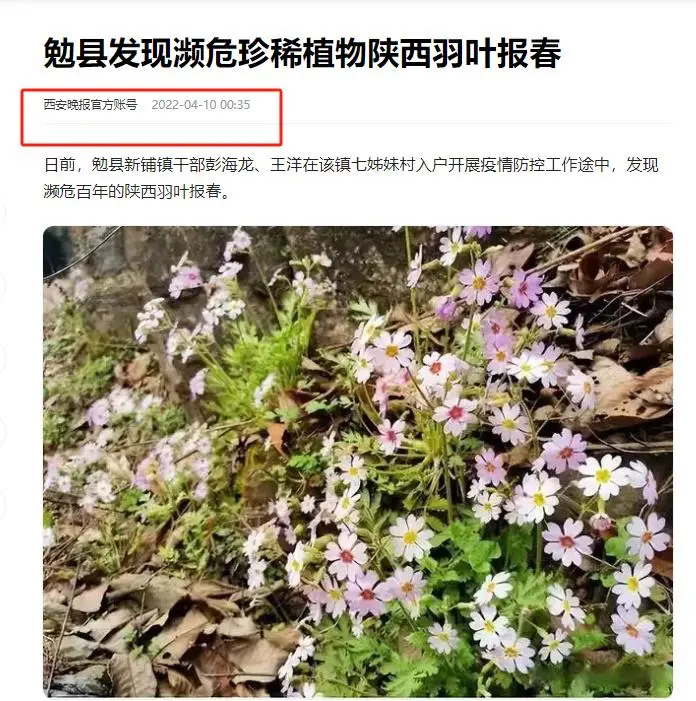 西安晚报《勉县发现濒危珍稀植物陕西羽叶报春》2022-4-10