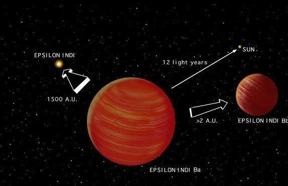 这颗行星在印第安座,一个南半球的星座,北边的小伙伴抬头是看不到的。它的家是个叫印第ε的恒星系统,离咱们太阳系不算远,排第11近。这个系统挺热闹,有三颗恒星:一颗主星叫εA,像个小号太阳;另外两颗小的,叫εBa和εBb,是棕矮星,个头比木星大40多倍。这俩小家伙靠得近,像双人舞一样绕着主星转,距离1500个天文单位,转一圈得6万多年!