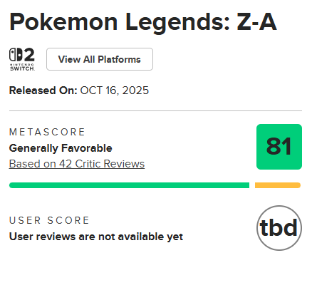 《宝可梦传说 Z-A》将于10月16日正式发售。该作M站评分也已正式解禁,截至目前,Switch2版媒体均分为81分,共收录42家媒体。
