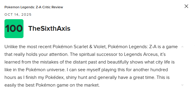 《宝可梦传说 Z-A》M站均分81:目前最出色的宝可梦游戏!