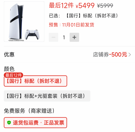 该店铺预售的国行PS5 Pro价格为5999元,可以免费领取-500元的无门槛券,相当于最终价格为5499元。作为对比,日版PS5 Pro在拼多多百亿补贴的史低价为4599元,而前段时间4699和4799元也能买到。