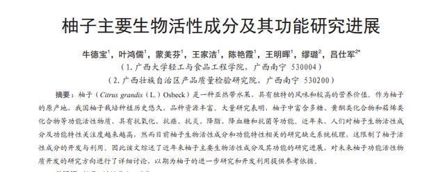 [1]柚子主要生物活性成分及其功能研究进展 牛德宝,叶鸿儒,蒙美芬,王家洁,陈艳霞,王明晖,缪璐,吕仕军 现代食品科技 2025-04-10