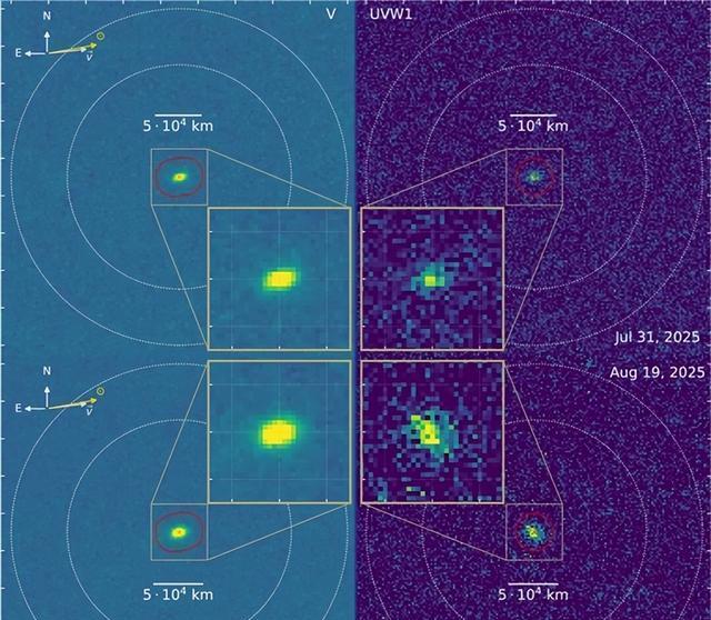 夏威夷莫纳克亚天文台的紫外光谱仪捕捉到了关键证据:彗发中羟基(OH)分子产生的特征辐射。羟基是水分子(H?O)在太阳辐射作用下分解的产物,其紫外微光的强度显示水分子的分解速率异常之高。加州理工学院团队通过建模计算发现,若按传统彗星模型推算,该距离下的水分子释放量应不足实际观测值的1/20。这一矛盾暗示3I/ATLAS可能携带着与太阳系彗星截然不同的物质结构——或是其内部存在超多孔结构使得冰粒更易挥发,或是其形成于极端低温环境(接近绝对零度)导致冰物质具有特殊物理性质。