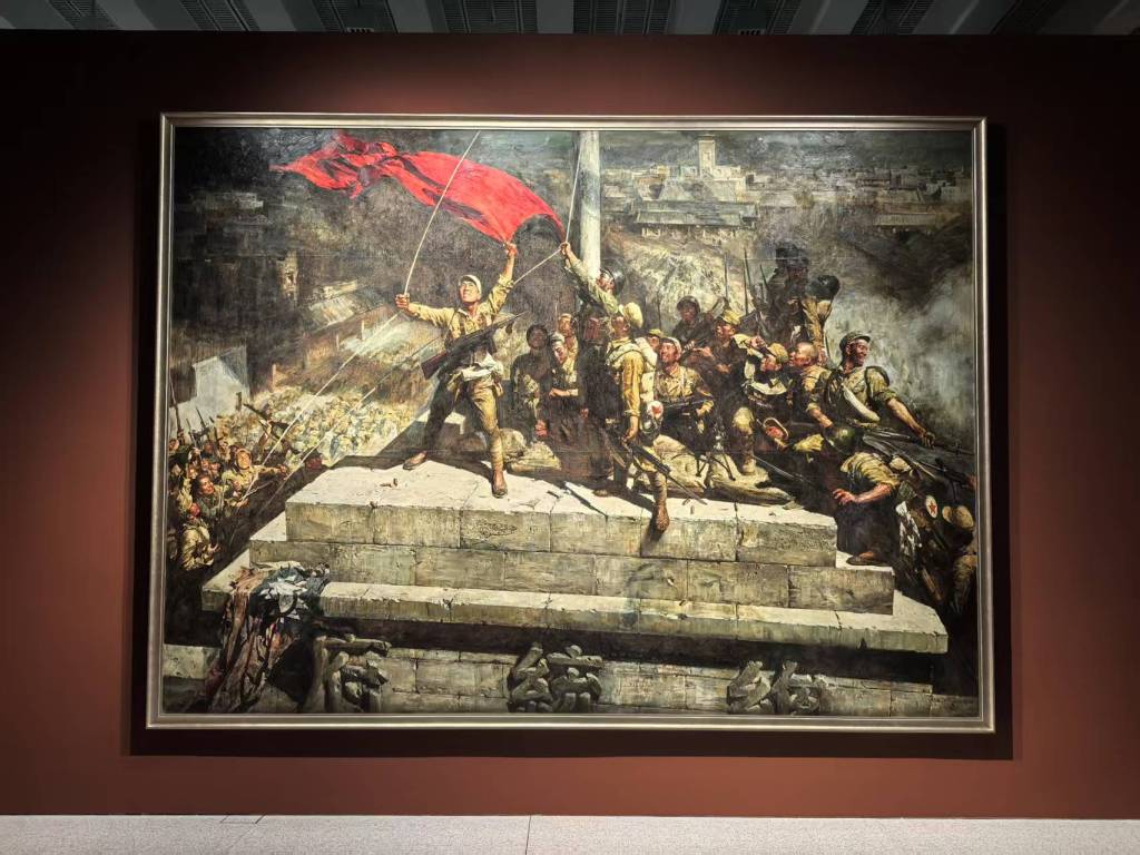 第三阶段:90年代中期到新世纪2000年后回国的几年里,画作特显视觉冲击力;水乡作品尺幅巨大,仿佛又回到了70年代那个红色印记那种熟悉了的大尺幅画面。用方头笔和圆头笔混合起来绘制作品,以厚重奔放的笔触,层层笔笔紧密相扣与交织,在高度结构、造型概括的画面中挥洒。可见有些作品寥寥几笔随意性很大,看似轻松的一笔,背后是数十年如一日的刻苦练习,非深耕绘画的深厚功底者不能驾驭,寻常画者绝无可能达成这般高度。这在70年代创作的一批作品中,如《占领总统府》背景创作中,运用厚薄相济的设色方式,调色油与颜料按不同比例混合后,在画布上自然流淌、渗透,形成深浅交织的痕迹。这种对材质流动性的巧妙控制,既保留了颜料笔触厚薄的生动质感,又强化了画面的视觉张力与情绪表达,最终在宏大历史场景的描绘中,展现出磅礴的气势与强烈的艺术感染力。1996年12月在上海博物馆举办个展,1997年2月巡展在北京中国美术馆举办个展。