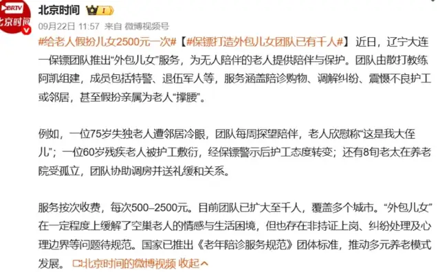 这是近年兴起的一种新型服务,由第三方人员以“临时子女”的身份,为子女不在身边的空巢老人、丁克老人提供情感陪伴、事务协助、乃至“撑场子”等服务,一次价格在500元到2500元不等。