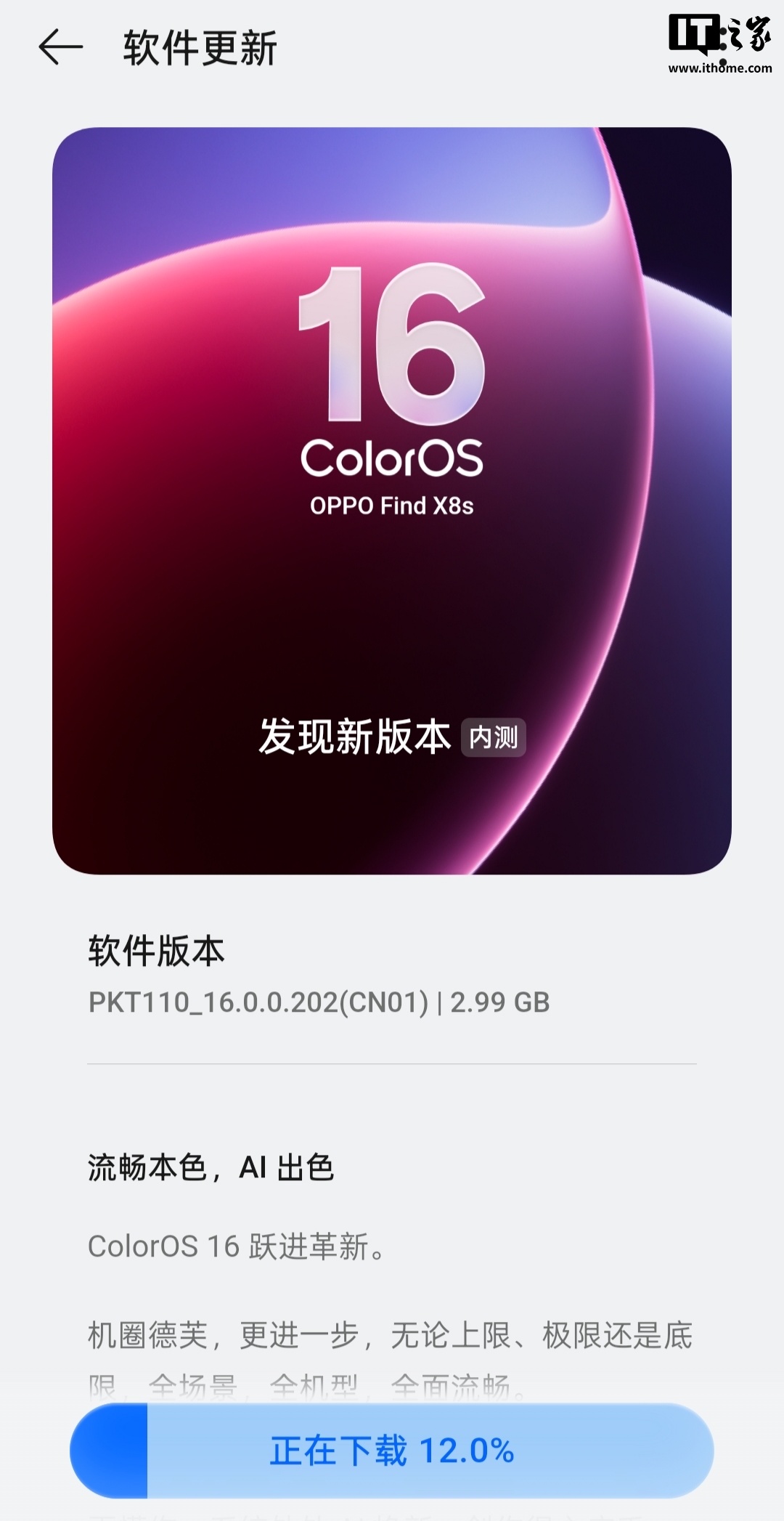 今日,ColorOS 16 首批机型开启内测升级,已有IT之家小伙伴收到更新,大小约 3GB。