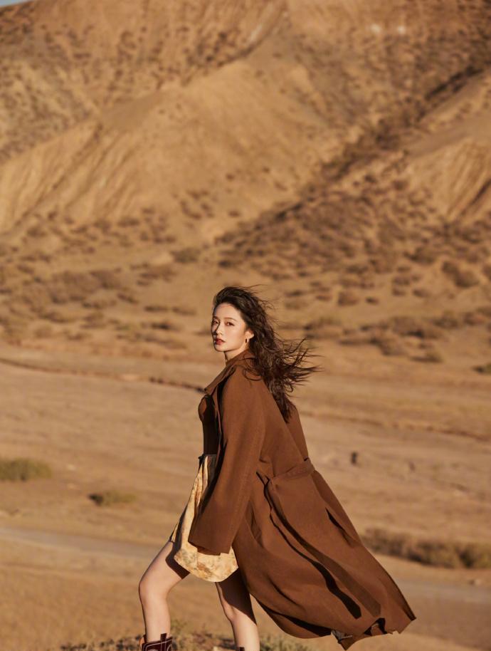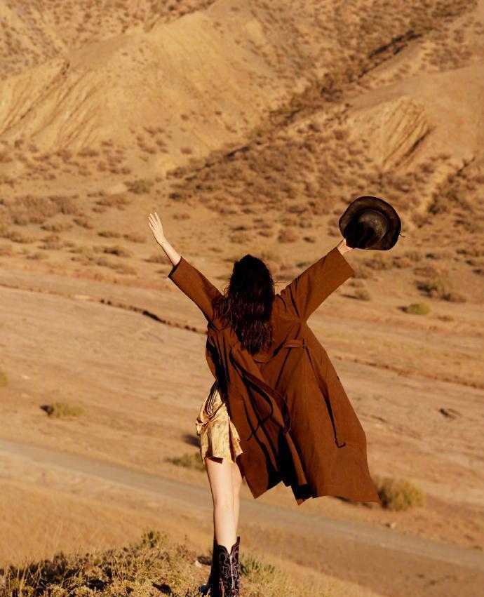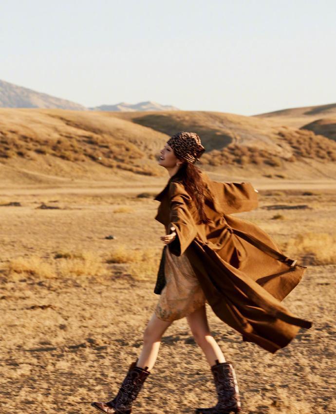 广袤的荒漠中,李沁身着棕色长款大衣迎风而立。大衣的质感面料与腰间随性系带设计,与内搭的浅色碎花裙形成巧妙碰撞。她侧首回眸的瞬间,发丝轻扬,深色牛仔靴上的刺绣图案为整体造型增添复古韵味。这组造型将都市时尚感与荒漠的苍凉完美融合,展现了她对多层次穿搭的精准把控。