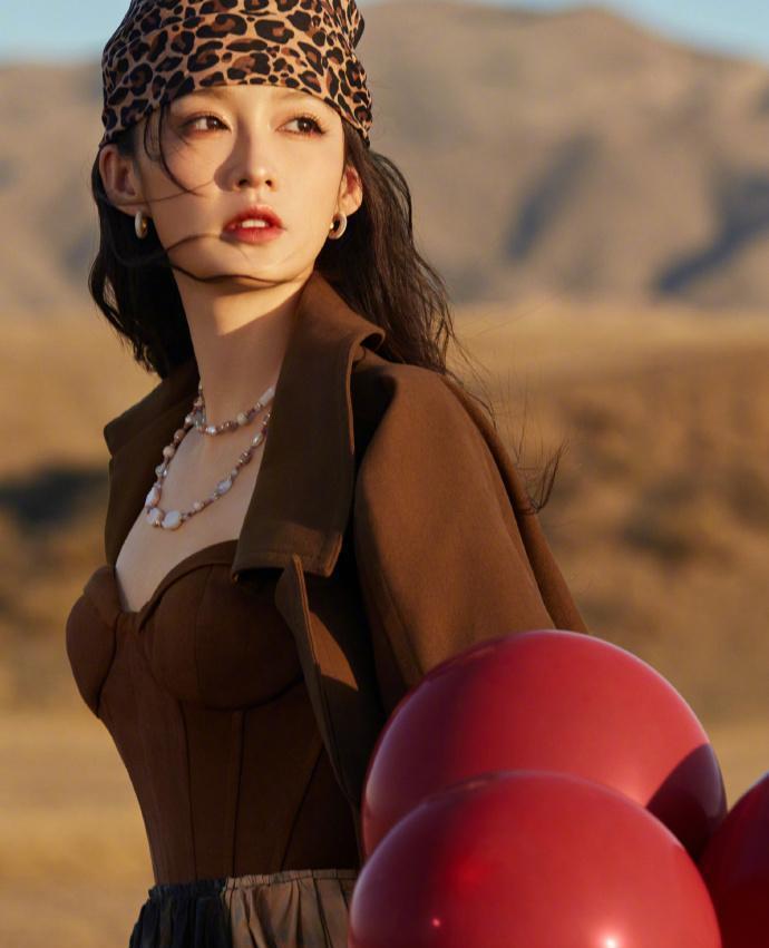造型迎来突破性转变!豹纹头巾与多层珍珠项链的混搭令人惊艳,李沁手握的红色气球成为荒漠中最亮眼的色彩。修身棕色上装勾勒出优越身材曲线,这种大胆的时尚尝试,展现了她不拘一格的穿搭智慧。从《红楼梦》中的少年薛宝钗到如今的时尚女王,她的时尚进化史有目共睹。