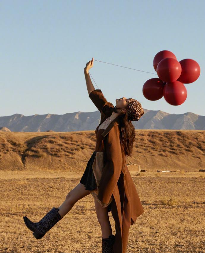 最富动态感的一张!李沁单腿站立高举气球的姿态,将牛仔靴的精致花纹与短裙的俏皮感完美展现。豹纹头巾随风飘扬,整个画面仿佛定格了她与荒漠共舞的瞬间。这不仅是时尚大片,更像她演员生涯的隐喻——始终保持着对表演的敬畏与热爱,在每一个角色中自由起舞。