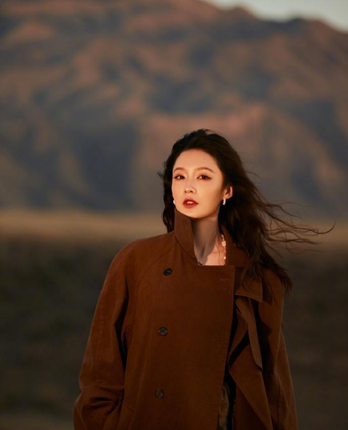 镜头拉近,李沁的深棕色风衣更显剪裁利落。她凝视远方的眼神沉静而有力,红唇成为整体冷色调中的点睛之笔。背景朦胧的山峦与她挺拔的身姿构成强烈视觉冲击,这组画面不仅展现了她的时尚表现力,更让人看到她内心深处的坚韧气质。