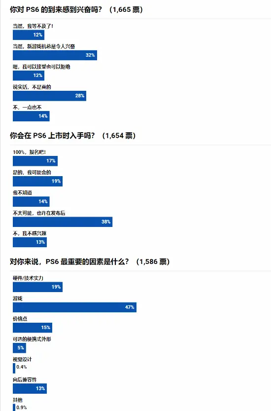 在超过1500名网友的投票中,约44%对PS6的到来感到兴奋,但只有17%左右的玩家表示自己一定会在首发时入手新机。在“哪一因素是吸引你购买PS6的原因是”,近一半玩家看重的是游戏阵容的质量,约20%则看重硬件、技术的提升。