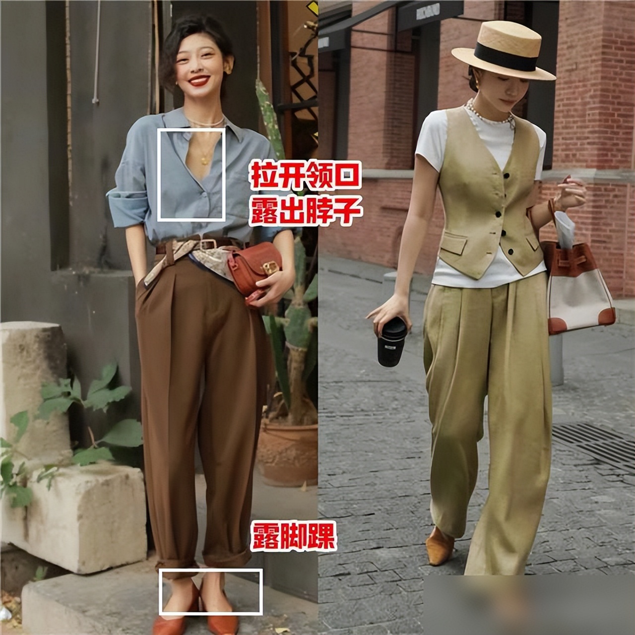 为了让上半身得到更加纤瘦显高挑,我们选择搭配长款或者长款加开衫,像宽松老钱裤自带遮掩胖点和修饰身材线条优越性的系列,同样也会有显矮显胖之类缺点。