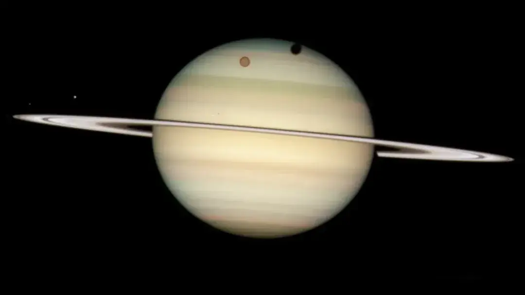 当土卫六的阴影穿过土星云层表面时,哈勃望远镜拍摄到的土星图像。