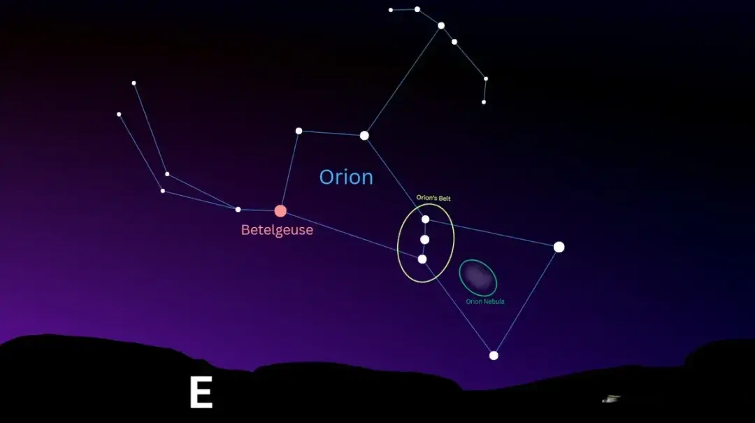 腰带上方的参宿四是一颗红巨星,也是猎户座最亮的恒星之一。科学家预测,它以后可能会变成超新星,那时候亮度可能跟满月差不多。