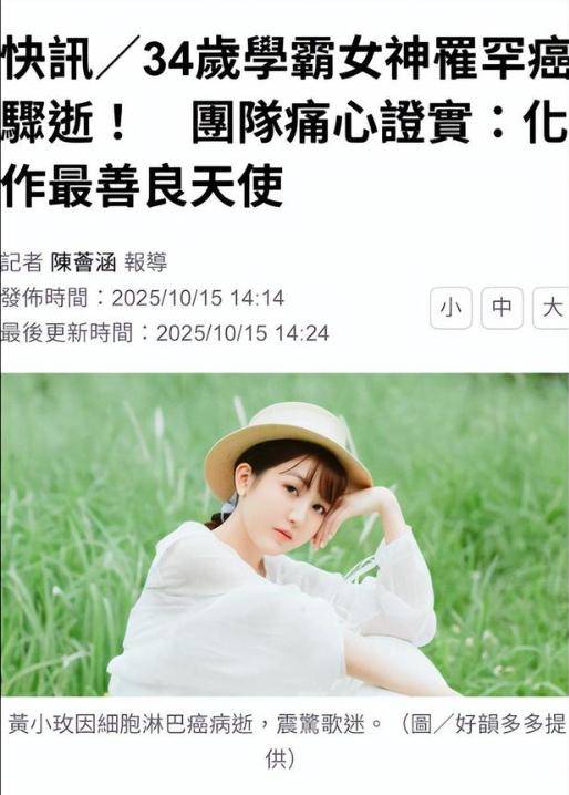 10月15号,我刷手机的时候突然就看到了,说那个唱歌很好听,长得又很漂亮清纯的女歌手黄小玫,人没了,才34岁,这个数字真的,太刺眼了。