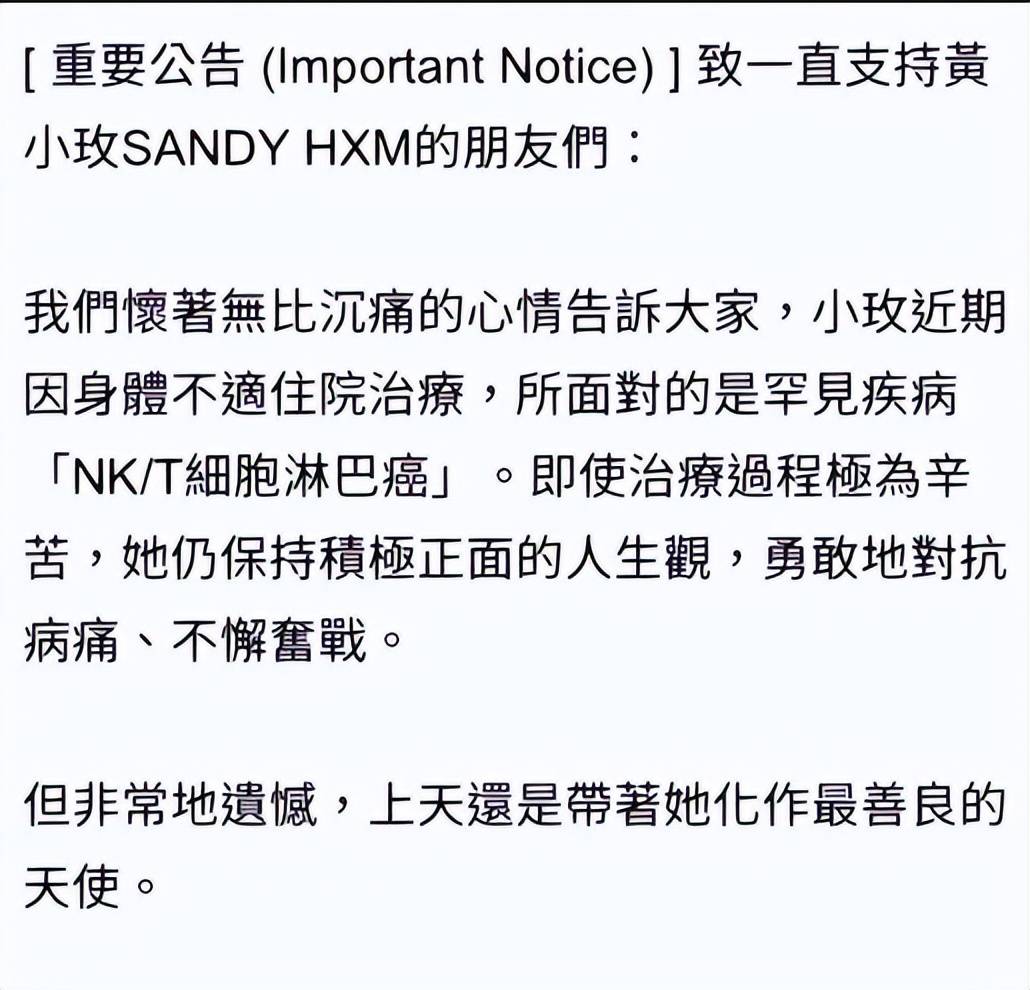 她的团队也发了消息,确认了,说她变成小天使回去了,还替她跟大家告别,说她最爱自己的家乡,是家乡给了她那么多写歌的冲动和想法,她希望大家听她的歌,能把心里那些不好意思说的感谢,好好跟身边的人,跟家人朋友都说出来。