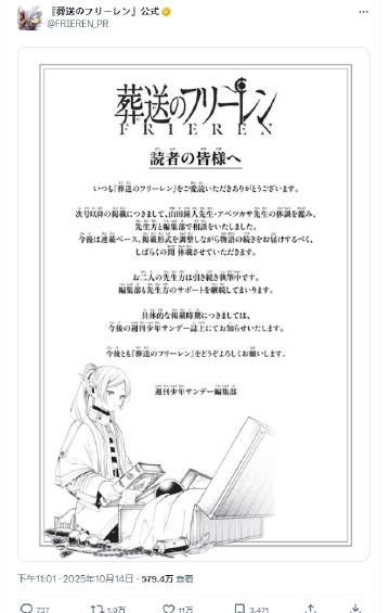 官方昨晚正式宣布,《#葬送的芙莉莲#》漫画现已进入无限期休刊停更状态。