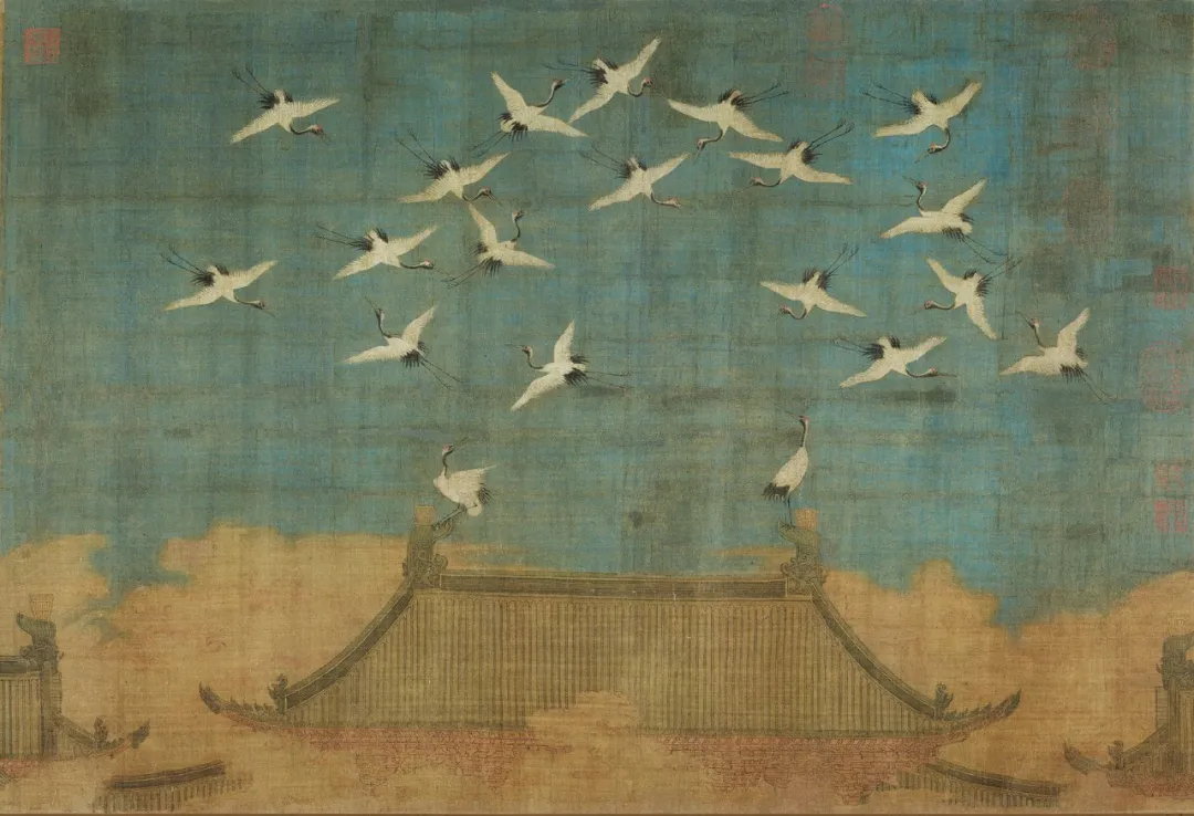 所以我先去查了鹤的习性,看看它们是否会这样;紧接着我又在史料中发现,紫禁城里有专门的道士驯养仙鹤。从明代反推宋代,信仰道教的宋徽宗可能也有这样的偏好。宋徽宗有自己的艮岳,当中也养着仙鹤,很可能在他登楼的那一刻,仙鹤被故意放了出来。这是一种推理,虽然没有找到直接证据,但我觉得它符合历史逻辑。