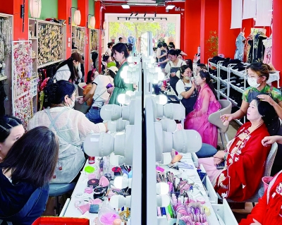 这家开在老城区的汉服体验馆,暑假期间日均租出200多套汉服,近六成顾客为年轻人。店主全璞向中国妇女报全媒体记者介绍,店里除了提供1000多套汉服租赁,还配套专业古风妆造和跟拍服务,“很多客人会租不同朝代的服饰打卡洛阳景点,人均消费200元左右就能体验‘穿越’的乐趣”。