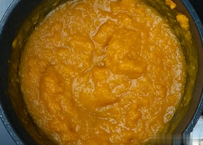 第二步:把准备好的南瓜倒入无水的锅中,用大汤勺不停地碾压成泥。当然啦,这种手工的方法免不了有少部分的南瓜块状残留,笔者建议有豆浆机的朋友可以把煮熟的南瓜在打一下最好。
