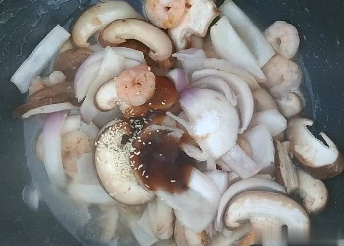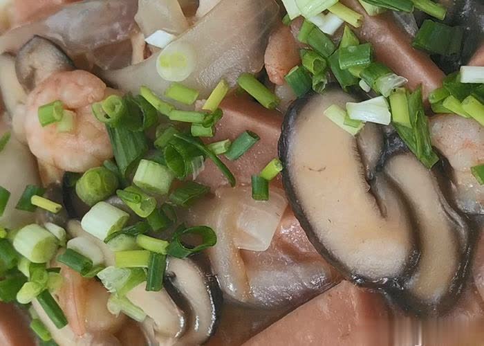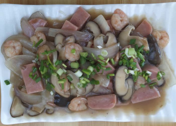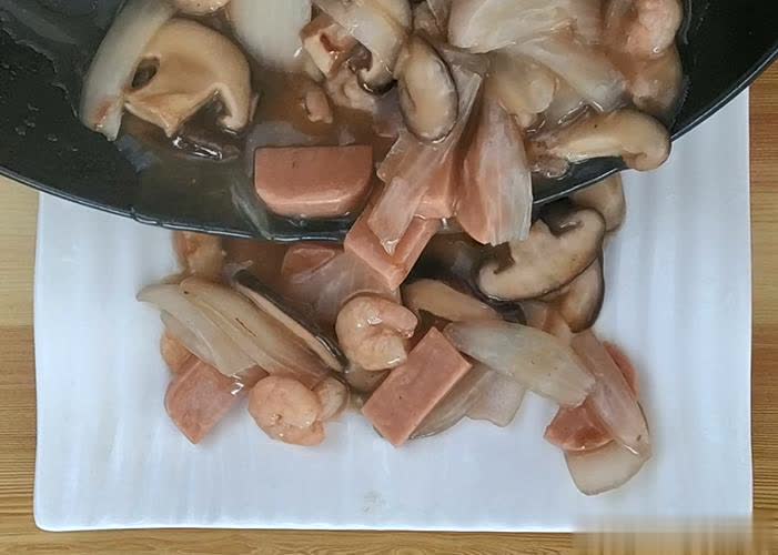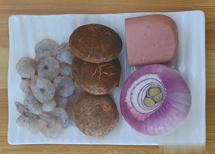 准备原料:鲜虾仁150克,香菇3-6个,洋葱一个,方火腿100克,葱少许;辅料准备蚝油,料酒,生抽,盐,鸡精,少许水淀粉即可。首先把香菇,洋葱,火依次处理,切片或切丁自己选择,在家做没有很多考究的。虾仁是笔者在鲜肉店买现成腌制好的。当然啦,您要是手巧的话,自己买新鲜的剥也是不错的选择。