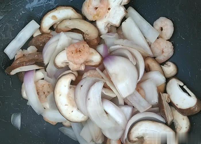 第二步:把洋葱和香菇倒入锅中,适当翻炒1分钟。