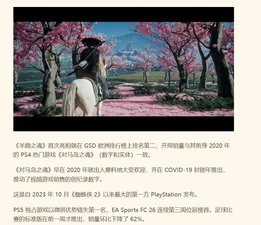 根据《The Game Business》报道,《羊蹄山之魂》已成为索尼自《漫威蜘蛛侠2》以来在欧洲地区最大规模的第一方游戏首发作品。值得注意的是,该作以明显低于Insomniac游戏的制作预算便达成这一成绩。