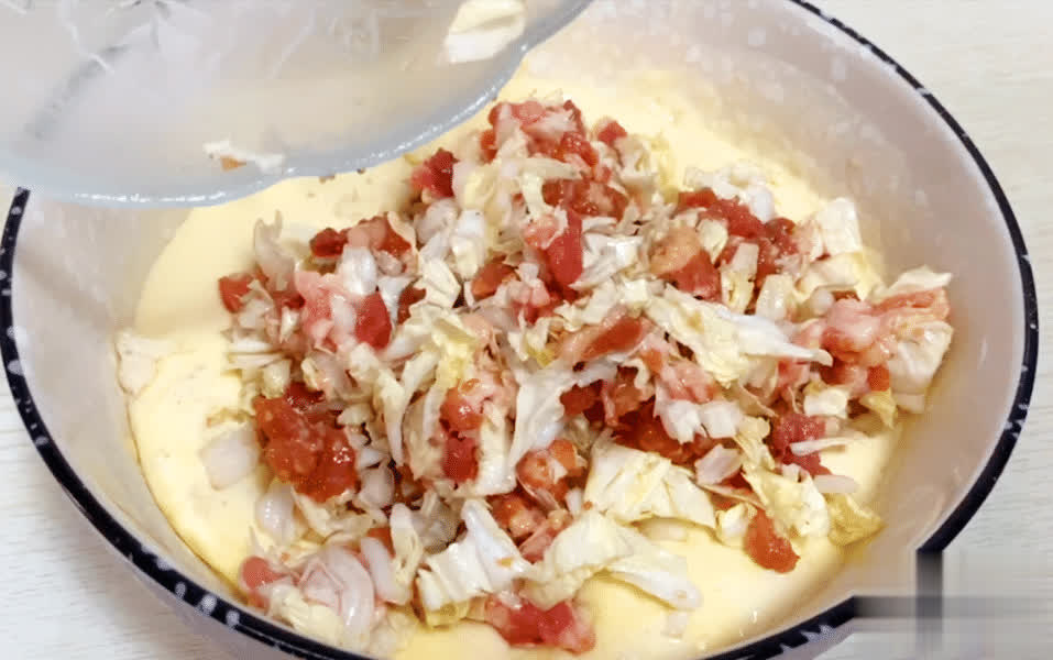 少量五花肉提前腌制好,白菜切碎倒入肉馅中,然后倒入醒发好的面糊中,搅拌均匀。面糊的做法是面粉加入一枚鸡蛋,加适量搅拌搅拌均匀,醒发半个小时即可。