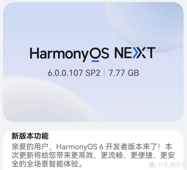 本次推送的鸿蒙6测试版具体版本号为HarmonyOS6.0.0.107sp2,安装包体积达到7.77GB,整合了多个版本的更新内容。