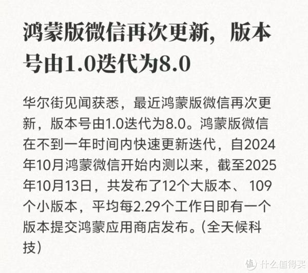 自2024年10月鸿蒙版微信正式上线以来,截至10月13日,已累计更新12个大版本和109个小版本,此次更是直接升级到8.0.11.34版本。