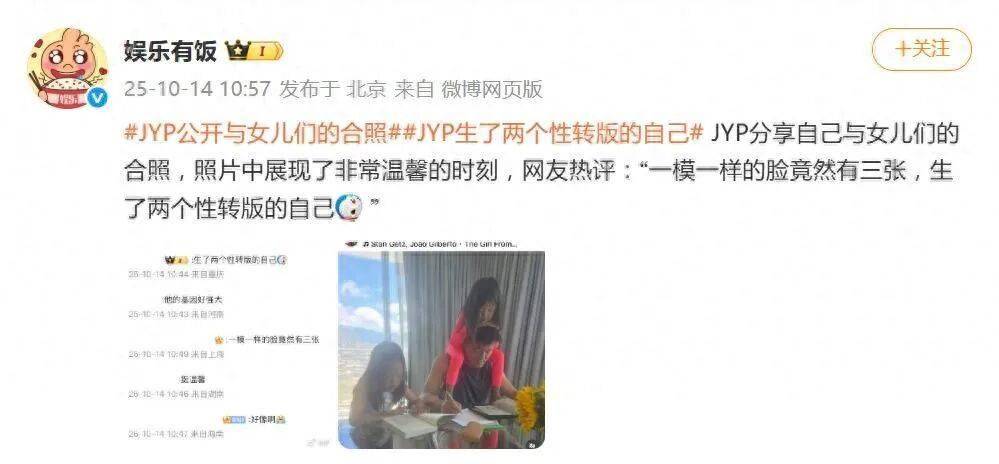 10月14日,有网友爆料,JYP娱乐社长朴振荣在Instagram上扔出一枚“温馨炸弹”——首次同时公开与两个女儿的合照,瞬间引爆全网。照片中,父女三人眉眼弯弯、笑容同步,被网友戏称为“三张复制粘贴的脸”“性转版JYP