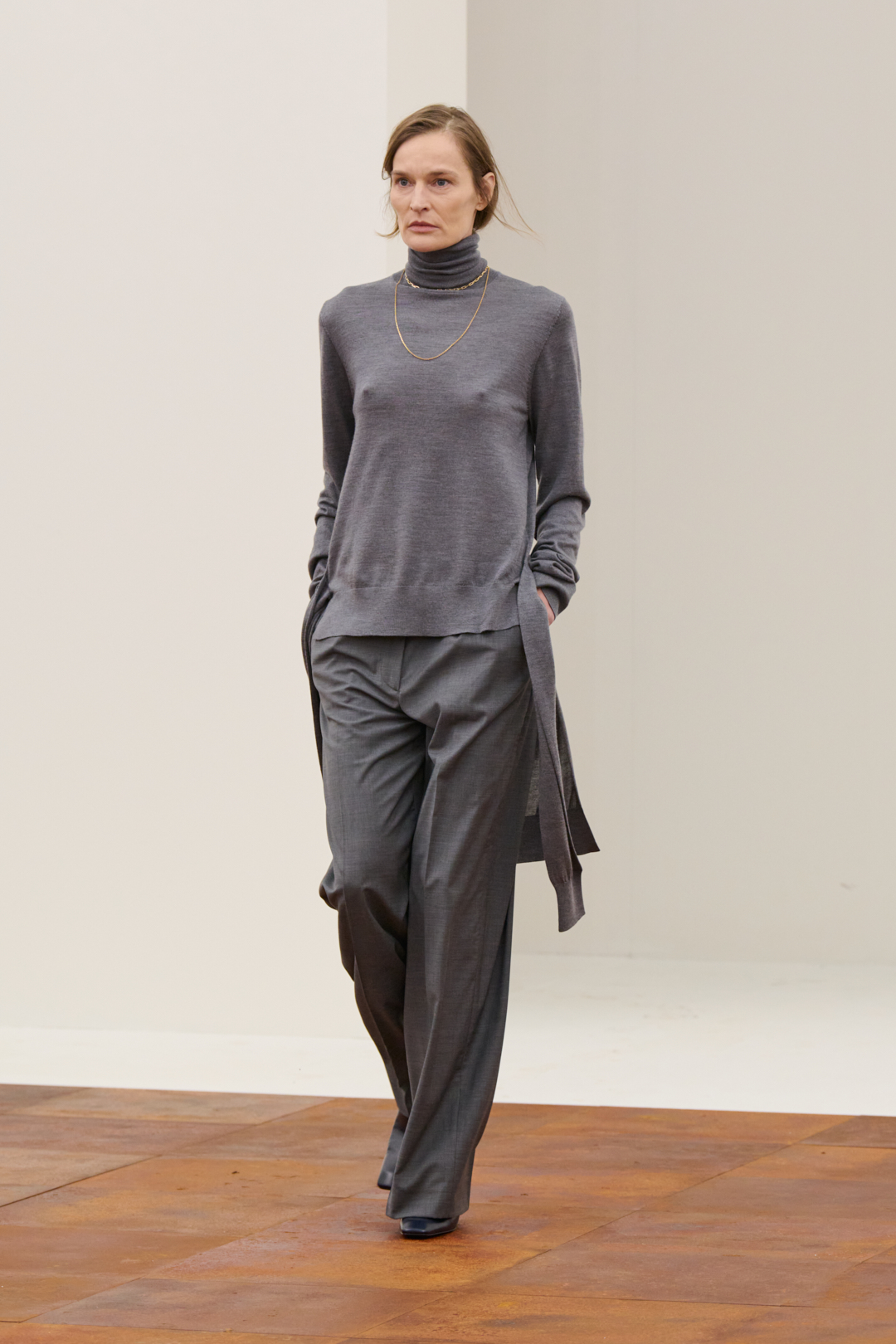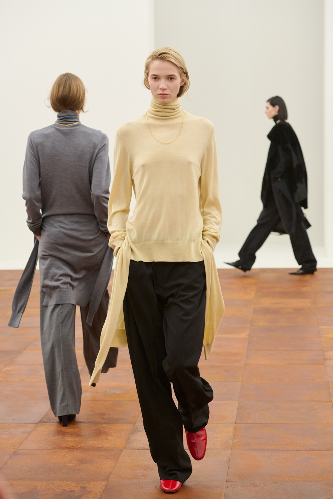 TOTEME 2025秋冬针织系列推出品牌全新经典——双袖高领毛衣。这款先锋设计在臀部位置增设额外衣袖,宛若将第二件毛衣随意系于腰间营造错觉。单品采用混入微量丝质的羊毛混纺纱线细密织就,呈现修身廓形,推出黑色