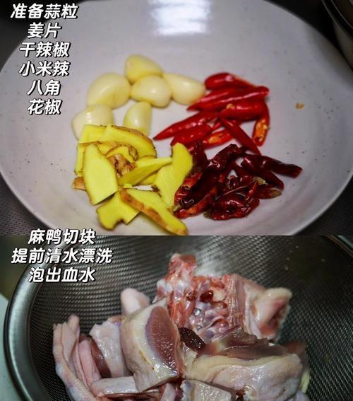 1. 鸭腿洗净,切成3厘米见方的块,冷水下锅,加1勺料酒、2片姜片,大火煮开撇去血沫,捞出用温水冲净,沥干水分;