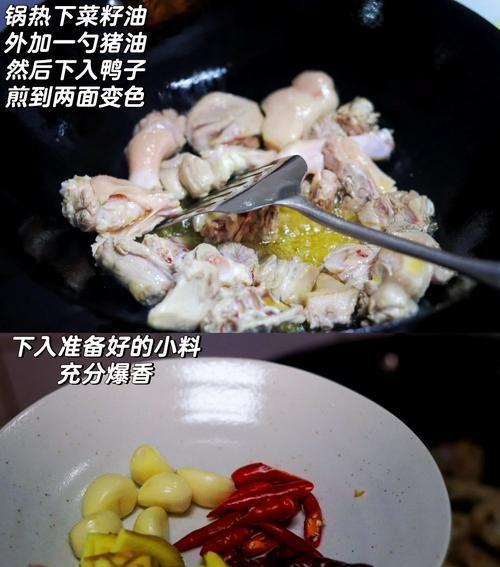 3. 放入焯好水的鸭肉块,大火翻炒至表面微黄,逼出部分油脂;