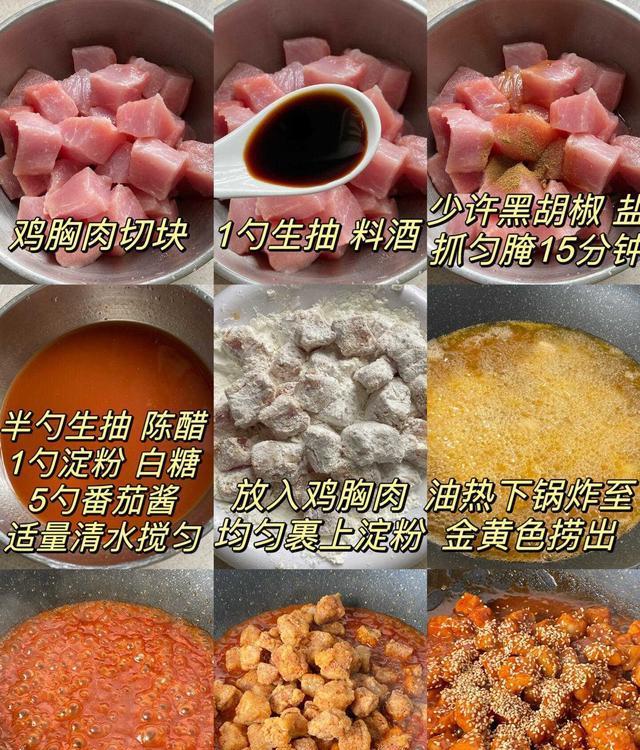 鸡胸肉别切太细,不然煎的时候容易碎;腌制时加淀粉是关键,能避免肉质柴硬;糖醋汁的比例可以根据自己口味调整,喜欢酸一点就多加半勺醋。