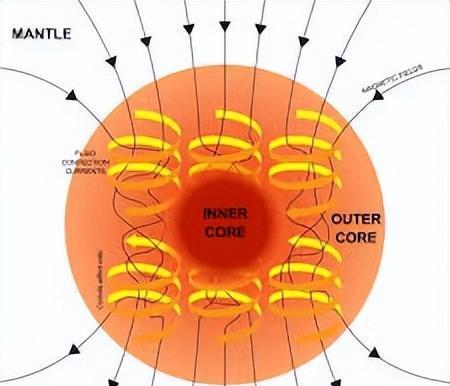 要知道,地球的磁场并不是天生就有的,它是地球在“呼吸”。地球内部有一个直径三千多公里的液态外核,里面是熔化的铁镍在翻腾。那是一锅沸腾的金属汤,温度比太阳表面还高。地球自转让这些导电的液体产生了环流,于是电流就像在一个巨大的发电机里打转,产生出地磁场。