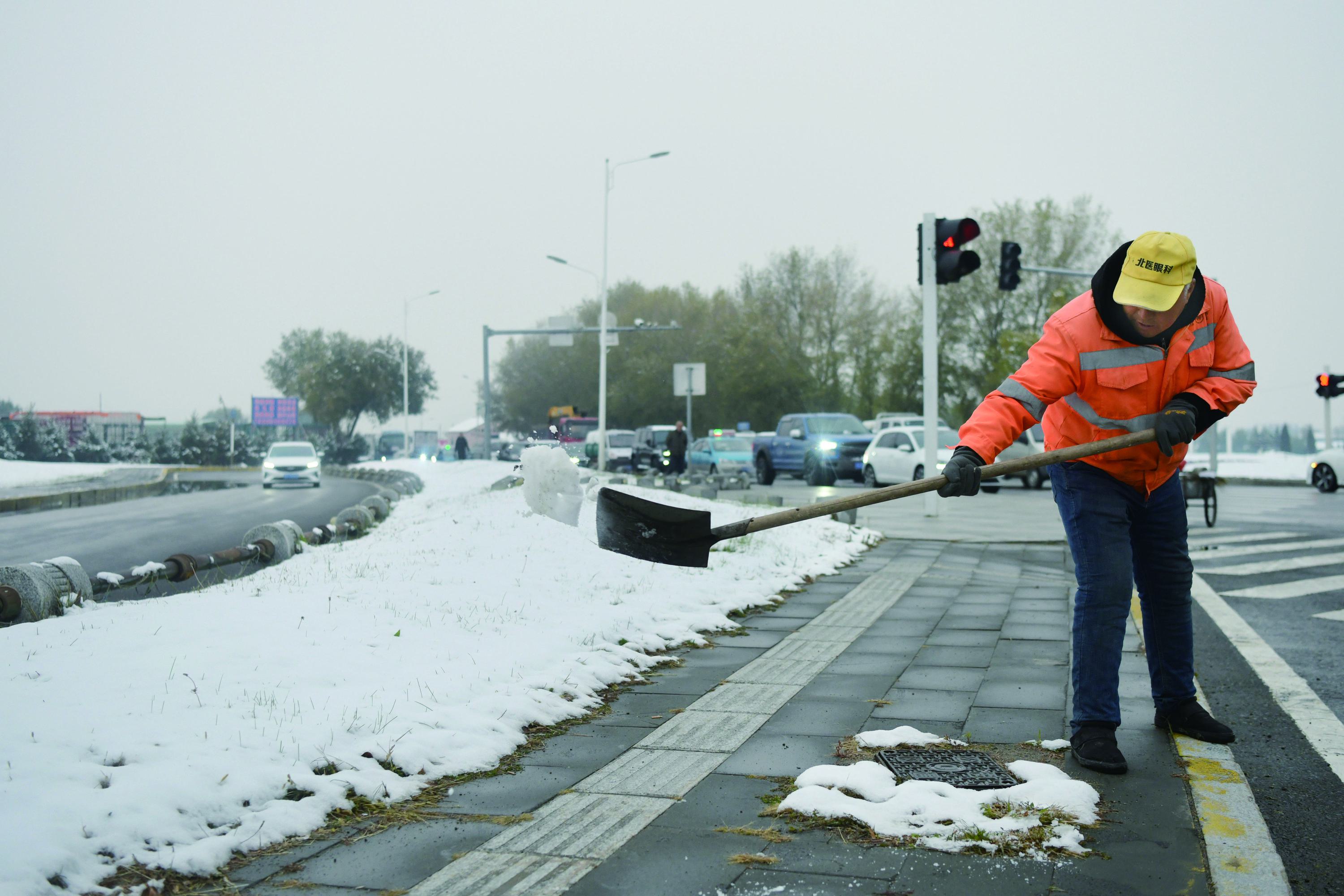 10月15日,在黑龙江省绥化市北林区,环卫工人清理路边积雪。