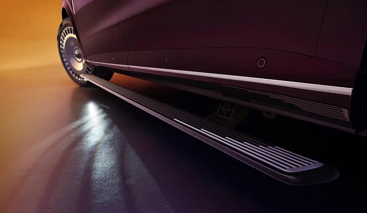 侧面饱满简约,配半隐藏式门把手和镀铬大饼轮毂,这种设计快成为高端车型的标配了,哦对了,还有双色车身,官图给的是紫色和金色搭配的双色车身,在中国的传统文化里,这两种颜色都是代表着富贵的寓意,组合出来的车漆颜色还挺不错,轮毂尺寸达到了22英寸,官图上轮胎规格为275/45 R22,可以选装密集辐条轮毂,配备电动伸缩踏板,方便上下车。