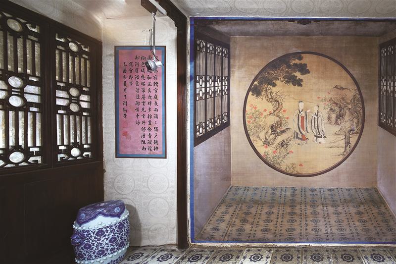 虽为平面绘画,却凭借精准的透视技法,营造出强烈的立体感与视觉延伸效果——仿佛在西墙上“打开”了一条通往花园的走廊,巧妙地将室内与户外连为一体。更令人赞叹的是,画中“走廊”的青花八宝地砖,与三希堂真实的地面纹样一致;两侧隔窗的芯纹,也与室内实际装饰如出一辙。这种细腻呼应,使得画境与室内陈设融为一体,真假难辨。
