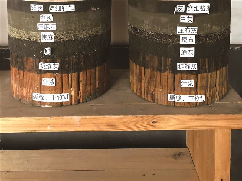麻层之上,还有“压麻灰”“中灰”两道工序。“压麻灰”将麻丝完全覆盖压实,“中灰”则抹平表面。