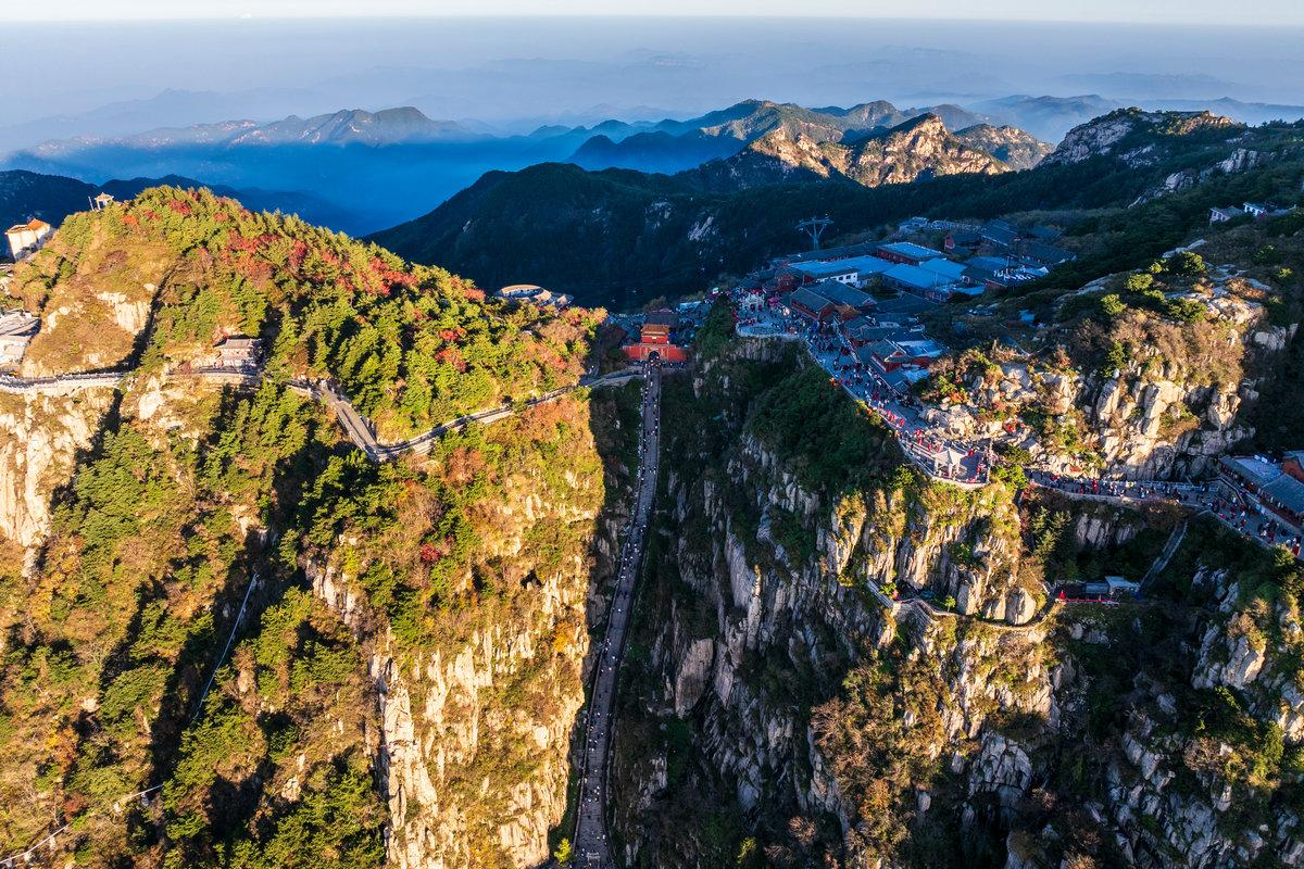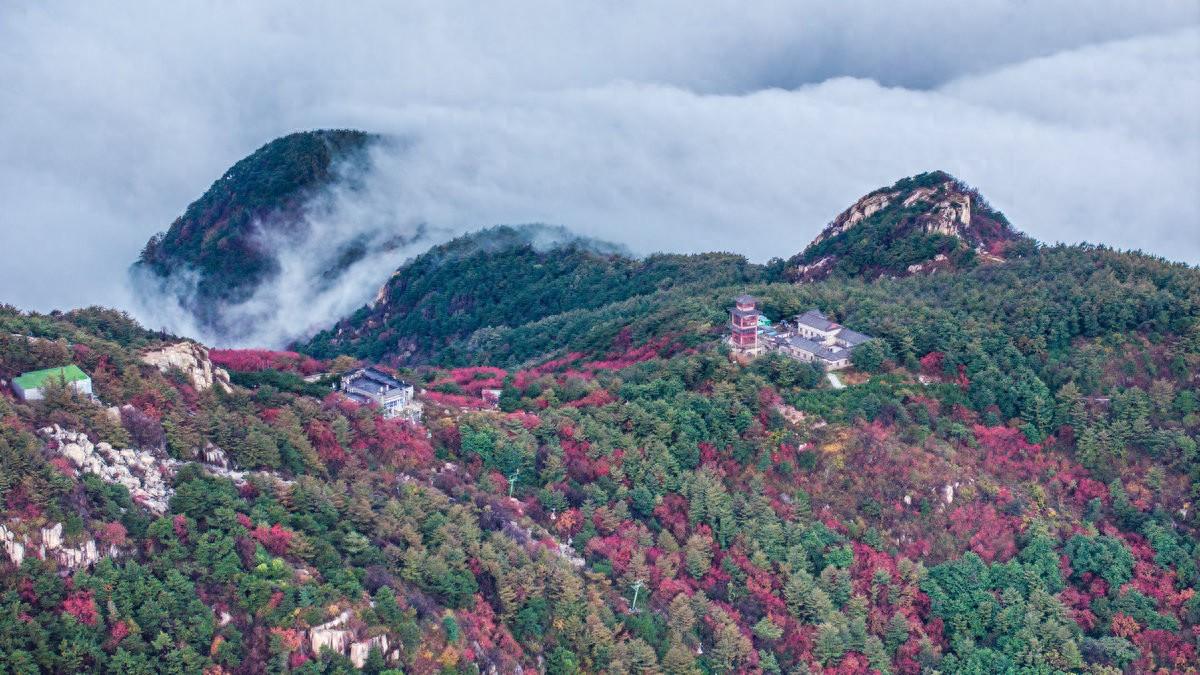 巍峨的山体在深秋的装点下,宛如天工挥洒的调色盘。炽热的花楸红叶似火燃烧,金黄的野菊点缀其间,与苍翠的松柏交织成一片绚烂的锦绣。这色彩不仅是自然的杰作,更是岁月与季节的深情对话。山间错落的古朴建筑——亭台、庙宇、石阶——默默伫立,为这幅画卷注入深厚的人文底蕴。依稀可见的游人身影,仿佛在诉说着泰山千古不变的吸引力与崇高。