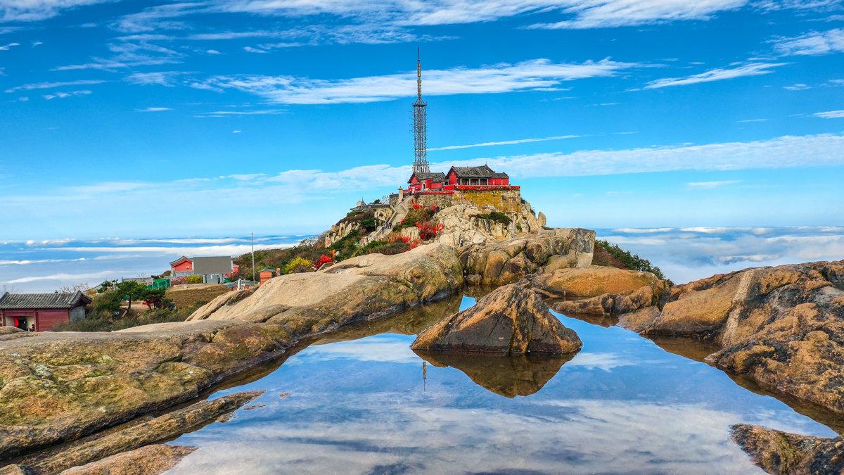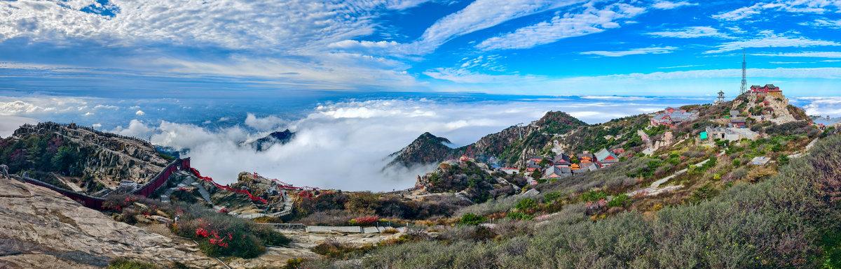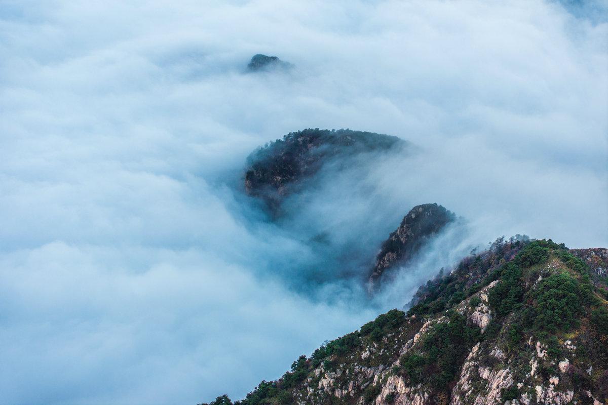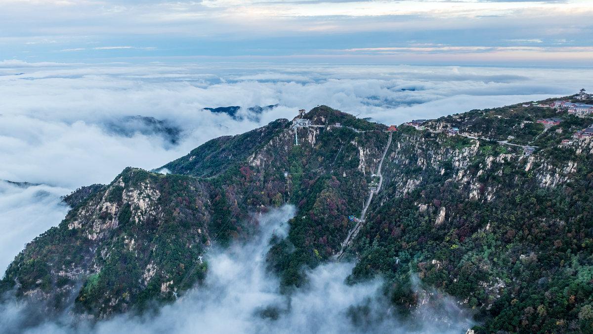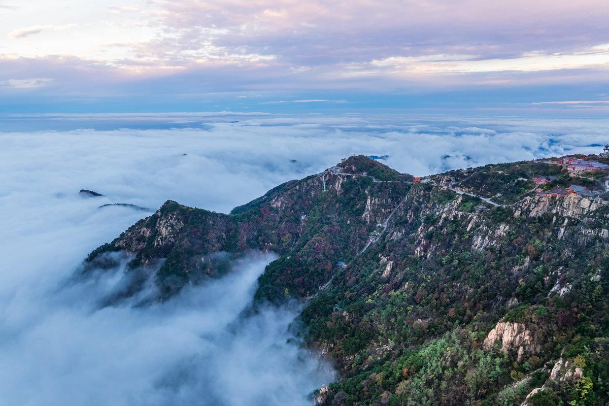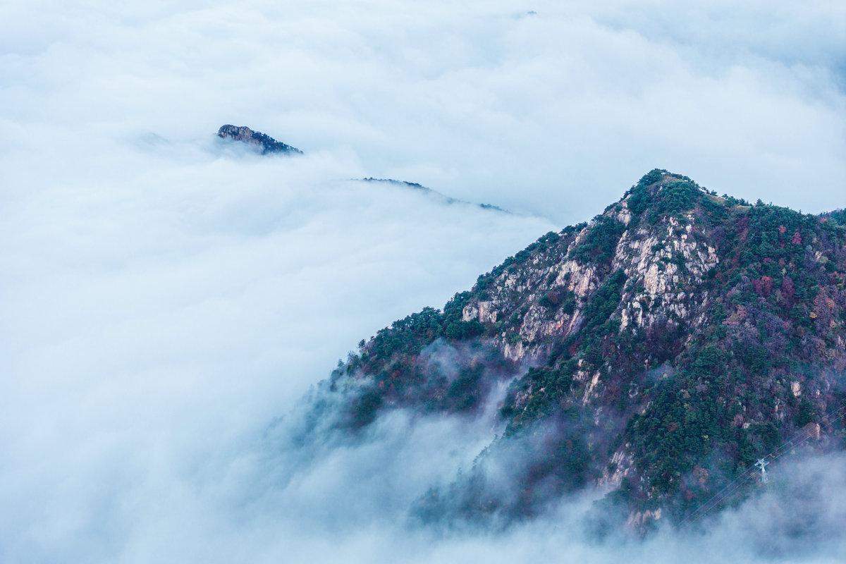 翻涌的云海,如轻纱般缭绕于山峦,将泰山托举于仙境之上。云涛起伏,时而淹没峰峦,时而散开露出一角青黛,与淡蓝的天际相映成趣。