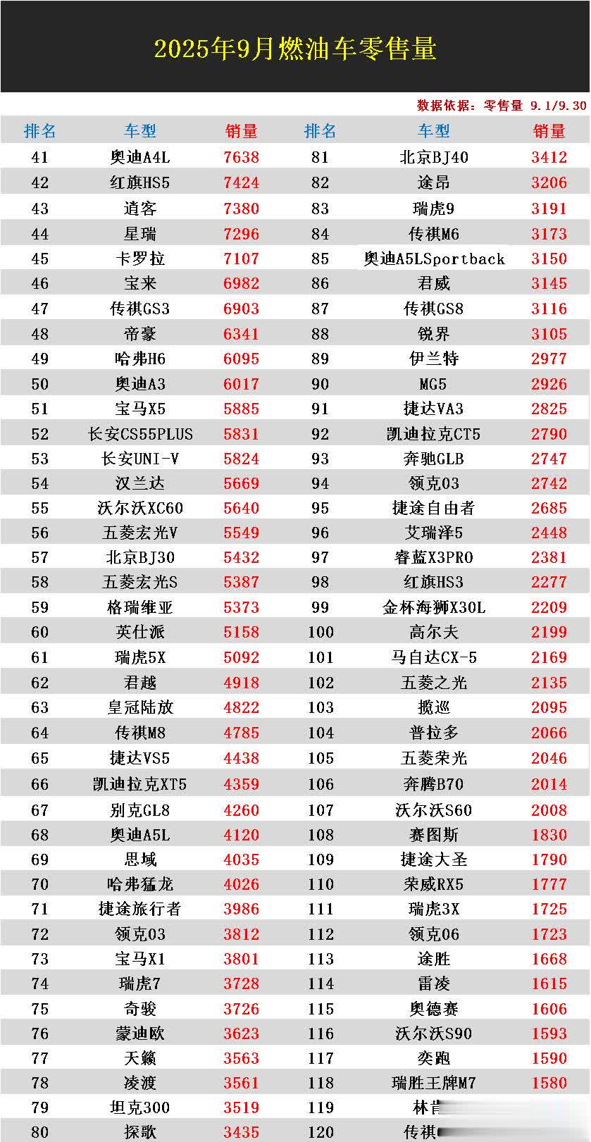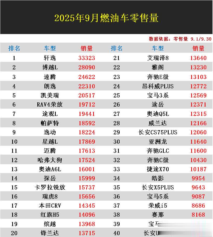 导读:随着金九银十销售旺季的到来,燃油车市场多款车型销量也都再次迎来了大爆发。根据最新出炉的2025年9月零售量排行榜数据显示,9月份燃油车市场共有33款车型销量突破万辆,其中合资品牌仍然占据榜单主导,日