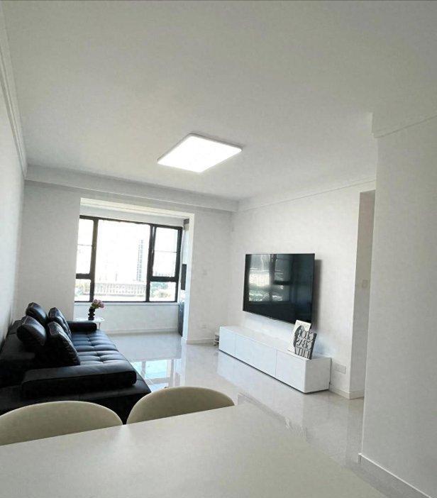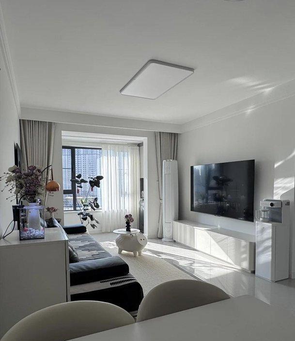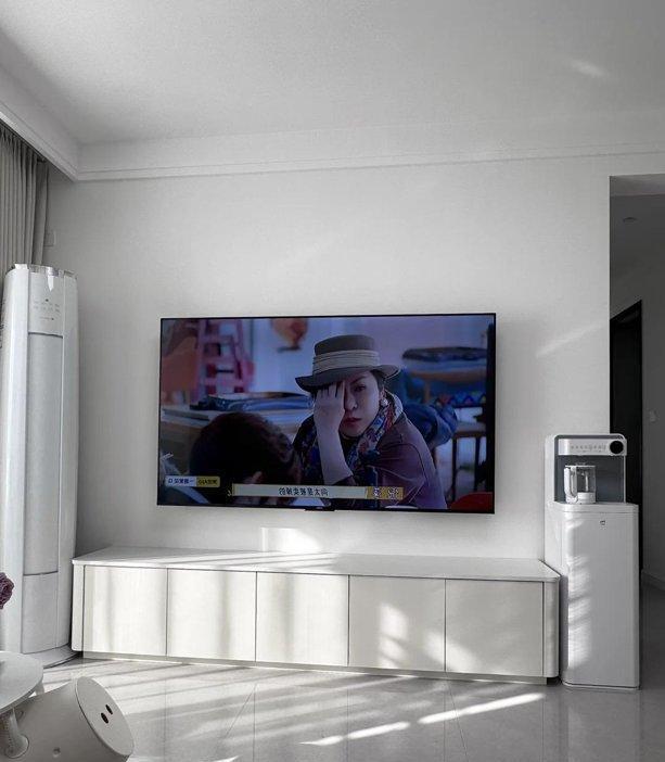 96平建面、65平套内,没做复杂吊顶,没贴石膏线,甚至连电视背景墙都省了,通刷菱花白乳胶漆配浅灰亮光砖,客厅就摆个一字型沙发、小茶几和落地电视柜,反而显得亮堂又透气,这不比堆一堆用不上的柜子强?