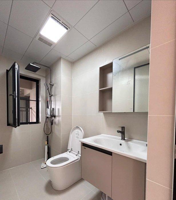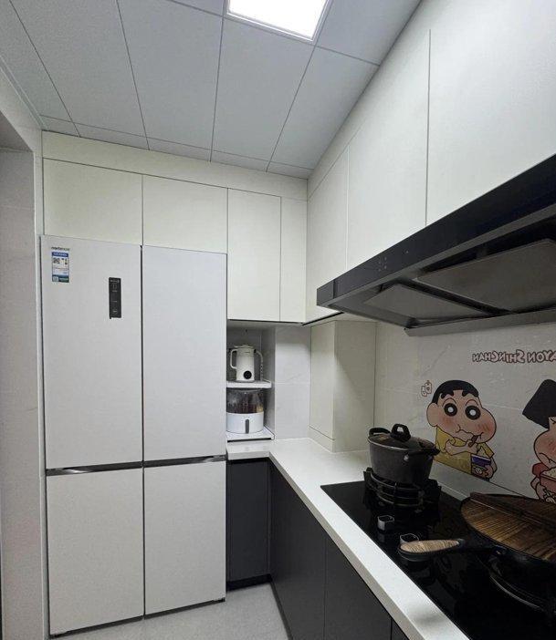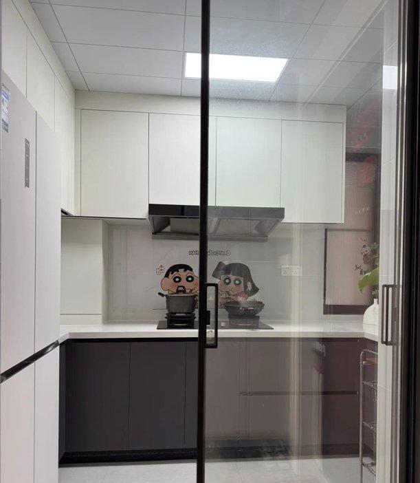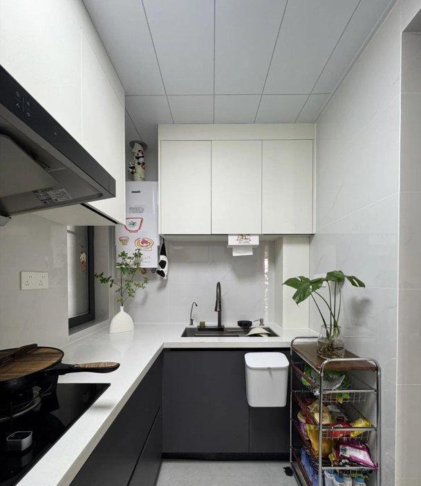 再说细节,卫生间浅灰瓷砖通铺,镜柜带储物格,浴室柜藏起洗漱用品;厨房L型橱柜配白色吊柜,台面空溜溜的——这种“看得见的简洁,看不见的收纳”,才是过日子的智慧啊!你有没有过“东西越少越舒服”的体验?比如周末阳光照进来,地砖锃亮,沙发上摊本书,连风都吹得更痛快,这不比“蹲在柜子缝里抠灰”强?