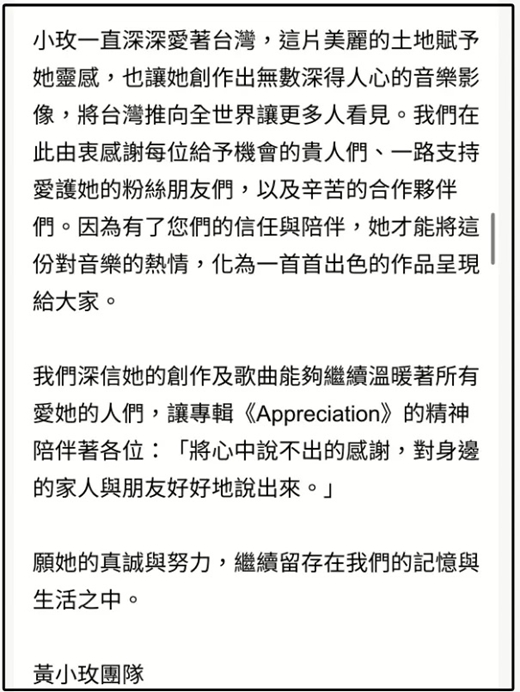 黄小玫的离去,给乐坛留下了太多遗憾。据透露,她离世前仍在筹备第二张专辑,部分 demo 还未来得及制作完成;原本计划年底举办的小型巡回演出,门票预售通道刚开启就因她住院紧急关闭。粉丝整理出她的音乐清单,从《前世今生》的婉转深情到《真不愧是你》的明快励志,每首歌都成了 “听一次少一次” 的珍贵记忆。​